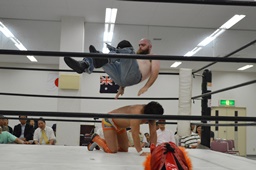 対角線コーナーに振る、マッドドッグ切り返して突っ込む、重野ショルダースルーでエプロンに出し、ロープに飛び乗っての反転ドロップキックで場外に落とす(左写真)。