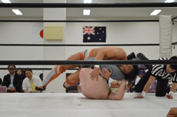 十字狙う、重野ブロック(左写真)、切り返してダブルレッグロック、マッドドッグロープ。