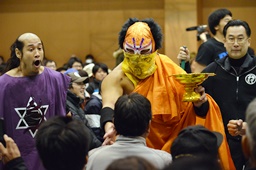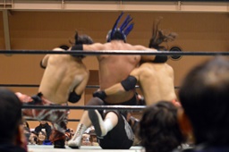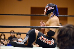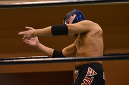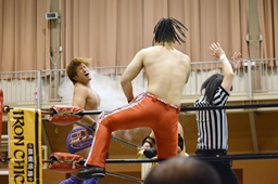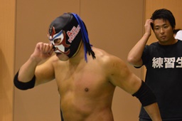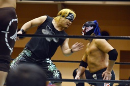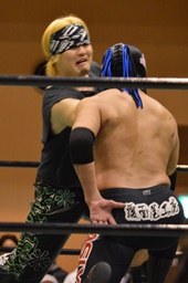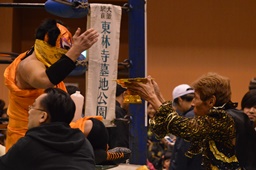 長い入場シークエンスをひたすら待つしかないみちのく正規軍とウラノ(右写真)。