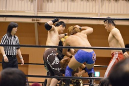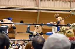 ウラノがシュウをボディスラム、日向寺がコーナーからダイビングエルボードロップ(右写真)、ケイがカット。