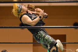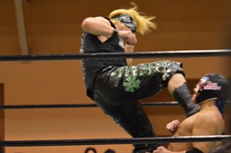 ロープに飛んでジャンピングハイキック(右写真)、カウント2。