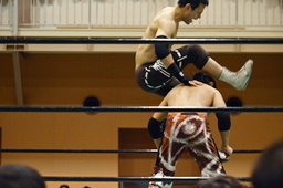 ロープに振る、日向寺フライングエルボーで返す(右写真)。