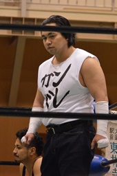 沼二郎ラリアット(左写真)、DDT、カウント2。人生にタッチ。