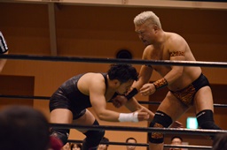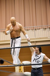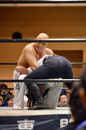 今成がカットに入るが人生は放さない(右写真)。大家自力でロープに。人生は沼二郎にタッチ。5分経過。