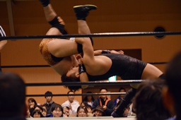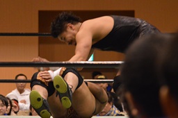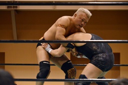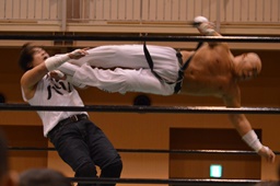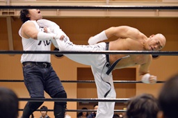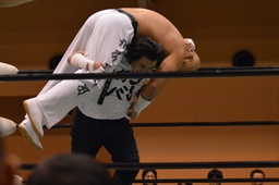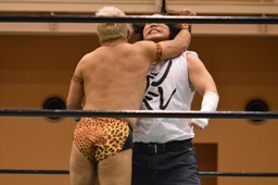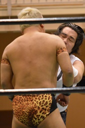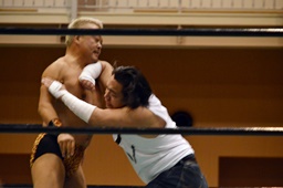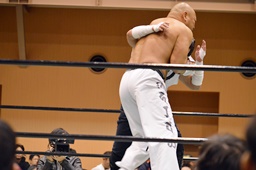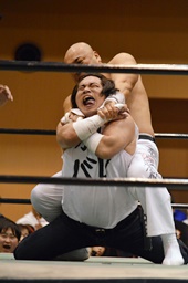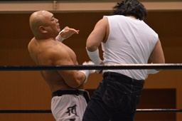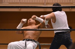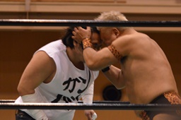 極楽固め(右写真)、今成がカット。沼二郎が今成を場外に。