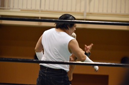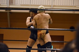 今成バック取る、沼二郎腕をひねって切り返す、ハンマーロックからヘッドロックに。今成ロープに振ってショルダーブロックの打ち合い(右写真)、