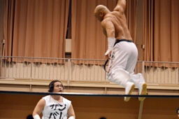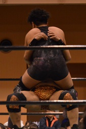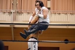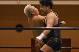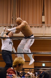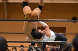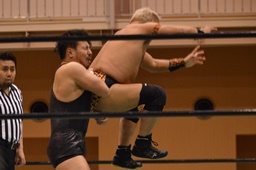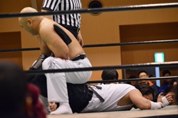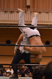 沼二郎ブレーンバスター狙う、大家ブロックして逆にブレーンバスターで投げる(左写真)、印南アリにタッチ。