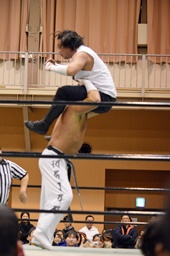 ロープに振る、沼二郎切り返す、今成フライングボディシザーズドロップ(左写真)、