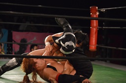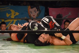 真霜は足をすくうと両足たたんでリバースデスロック(左写真)、さらに弓矢固めに。丸山ロープ。5分経過。