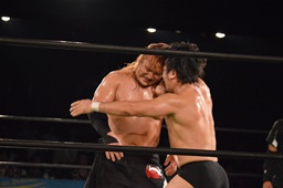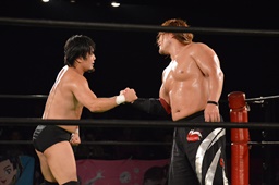 両者握手(左写真)。素晴らしい試合。このカードを組んだ志田えらい。