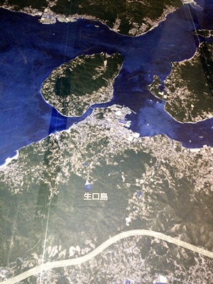 空港の床にはしまなみ海道の航空写真が。でかいなあ、生口島。