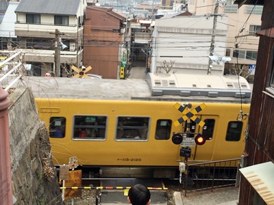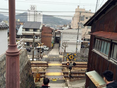 坂を下りると踏み切り。