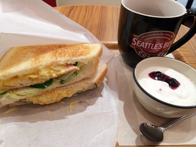 鹿児島中央駅で朝食摂れるとこ探したが「SEATTLE'S BEST COFFEE」しかないので仕方なくホットサンドセット食う。