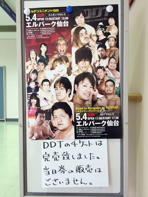 12時半にエルパーク仙台に着いてまずはユニオン。夜の部のDDTのチケットは完売。完売はいいことだが、安く入ろうとしてた学生が入れなくなるんだよなあ。