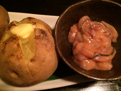 じゃがバター塩辛つき。ビールはスーパードライだったので最初の一杯のみ。あとは冬花火、田酒、久保田碧寿と日本酒3杯。いいチョイスだなあ、この店。