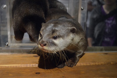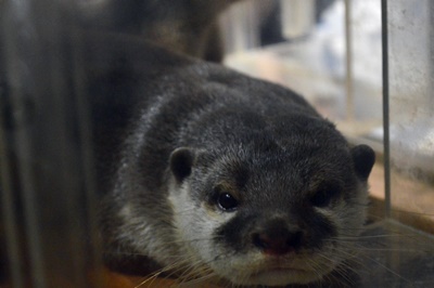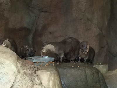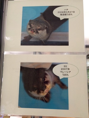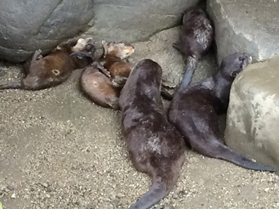雨ひどくなってきた。ちょっと歩いてカワウソ舎「カワウソワールド」を発見、しかしカワウソの姿はなし。はずれかなー。しかししばし待ってると朝食&寝床掃除のためマサ・ピアの夫婦とチビ4頭が出てきた。もうアジとか食えるようになってるんだね。