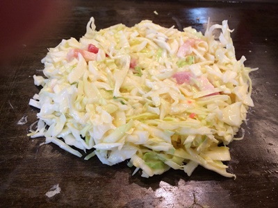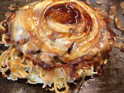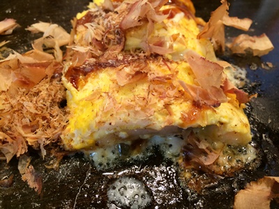 一旦海遊館を出て隣の天保山マーケットプレイスの「鶴橋風月」で豚玉モダン。