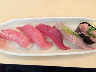 すすきのの「すしざんまい」で朝飯。まぐろ五貫盛りとしまあじ、ほっき貝、うに手巻き。