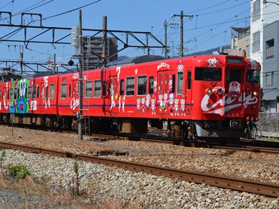 ロケ地撮り終えて尾道駅に急ぎ気味に向かう。ちょうどカープラッピング列車が出るところ。なんかラッキー。