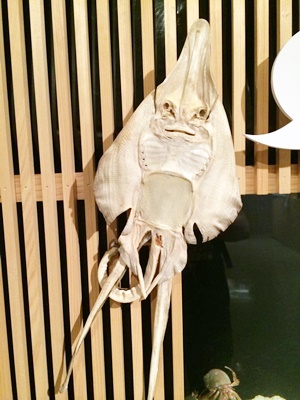 15分歩いて宮島水族館到着。カワウソのとこ行く前に「日本の魚食文化」という特別展示やてったので見る。ネットで有名になったサカタザメ(ガンギエイとも)の干物。
