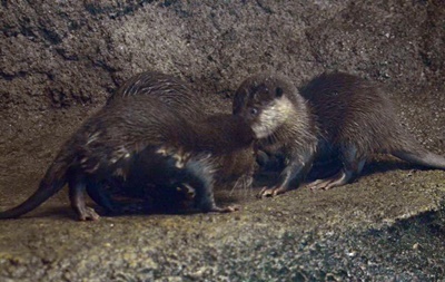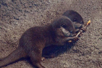 現在ベビウソの展示は14時30分〜15時限定ということでサンとイヨカンの両親だけでも見れれば、くらいの気持ちでカワウソ舎に。行った時点では1頭もいなかったが、一旦外に出て戻ると突然6頭全部出てきた。ラッキー。