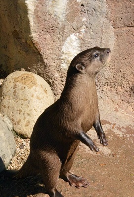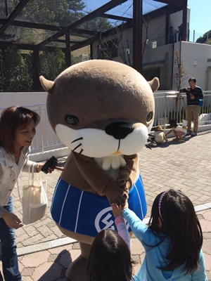 リムジンバスを松山市駅で降り、10時半発の路線バスに乗り換えてとべ動物園に。入るとゆるキャラ、幻(げん)くんが。ニホンカワウソがモチーフで、いまや幻になったことから命名。ちなみに愛媛県はまだニホンカワウソの絶滅を信じていないらしい。
