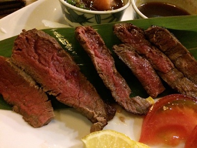 締めは伊予牛のステーキ。飯ものは明日に回しこれで終了。今回泊まる松山ニューグランドホテルは自家泉源の天然温泉持ってるというので選んだが、お湯がぬるぬるしててなかなか。道後温泉と同じ泉質ってわけはないが、これでも十分。