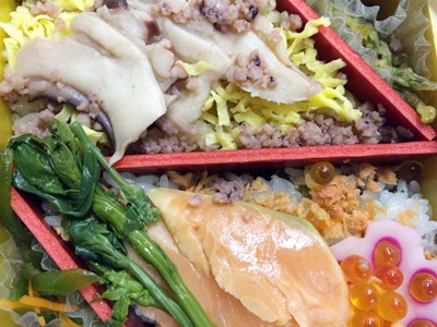 ビール飲みながら駅弁「漁師のごっつおめし」。