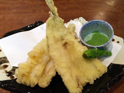 メギスの天ぷら。また贅沢だ。朝食えなかったってだけでこういう反動が。日本酒も2合。