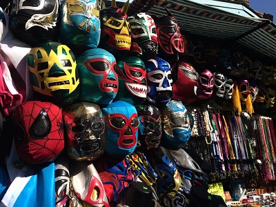 駅前の「プエブラ」。メキシコ料理と土産の店が並んでいる。マスク見るとテンション上がる。