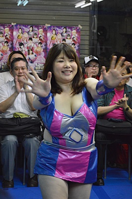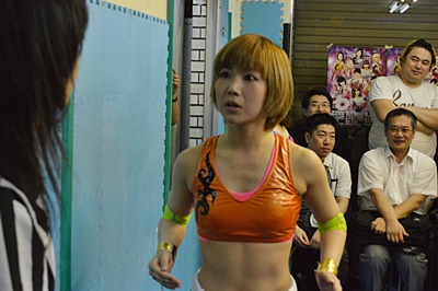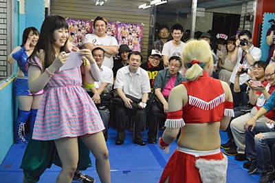 試合開始。先発はのの子とKANNA。のの子「今日はリリコAIDだから舞い踊るぞー!」(左写真)