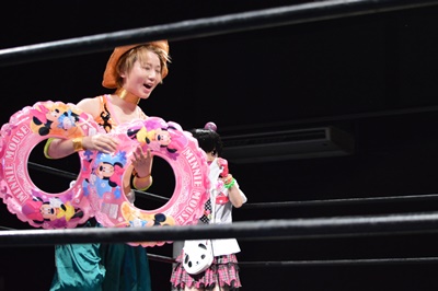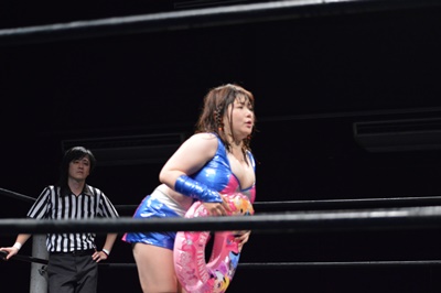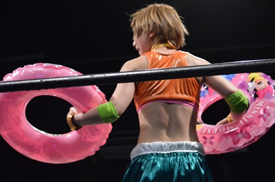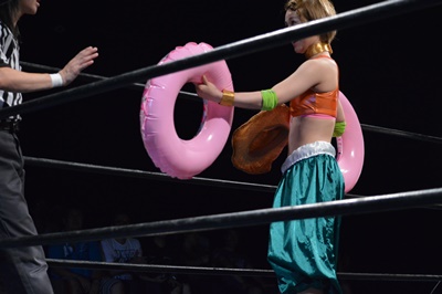 坂崎ユカ、浮き輪2つ持って入場(右写真)。トーナメント準決勝だろうが何だろうがこの人はこれなのだ。むしろ準決勝で相手がのの子ということで考えた結果が多分これ。