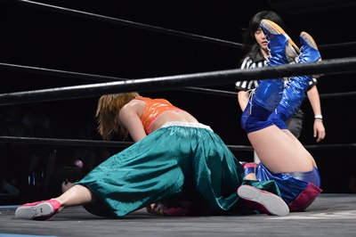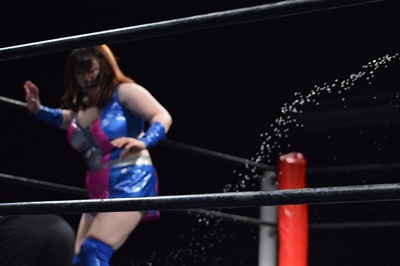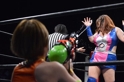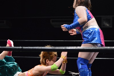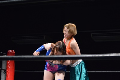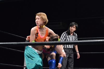 体重掛けて倒すと変形キャメルクラッチ(右写真)、のの子ロープ。のの子そのまま場外エスケープ。