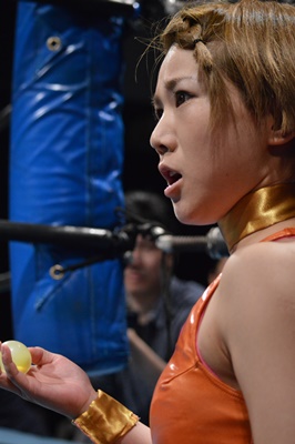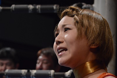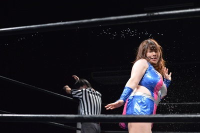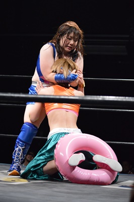 のの子はドラゴンスリーパイ(右写真)、坂崎がギブアップしないまま動かなくなったのでレフェリーが止める。