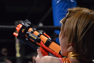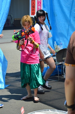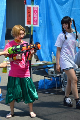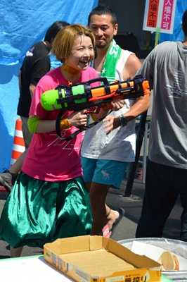 休憩時間も水鉄砲持って暴れる坂崎(左写真)。