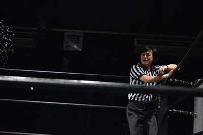 木曽レフェリーにひとつ貸そうとするが木曽レフェリー当然断る(左写真)。