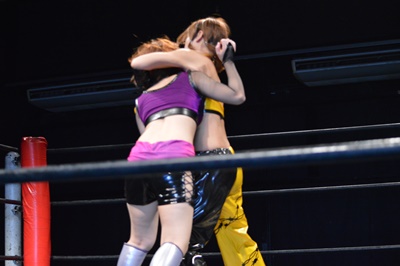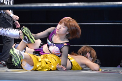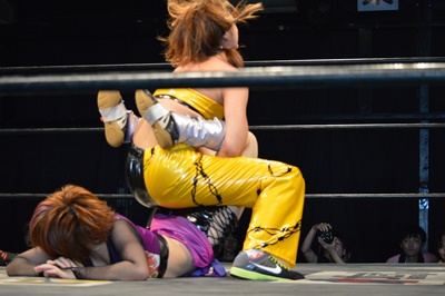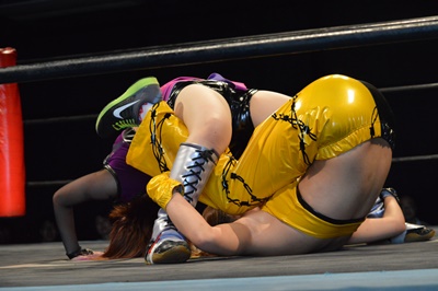 ロックアップ、KANNAヘッドロック(右写真)からフライングメイヤー、木場はヘッドシザーズで返す。