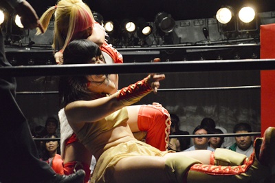 えーりんドロップキック3連打(左写真)。中島ネックロック、自軍コーナーに下がって山下にタッチ。