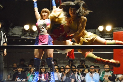 ブラジリアンハイキック(左写真)、中島にタッチ。コーナーに振る、えーりん切り返して串刺しドロップキック、のの子入ってKカップアタック。