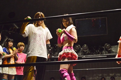 最後はメインで勝利した中島が観客に「強い子ー!」と叫ばせて「翔子ー!」で締める(左写真)。