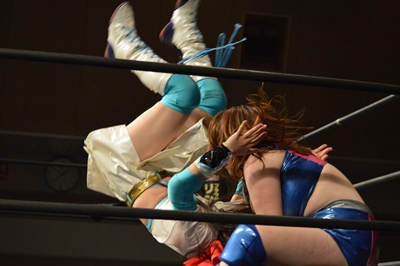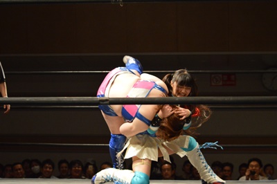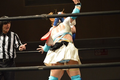 コーナーに上ってスイングDDT(左写真)、カウント2。