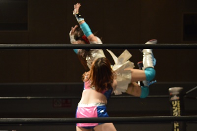 清水はパイフライフローをかわすとコーナーに上ってフライングクロスボディ(右写真)、カウント2。