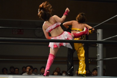 ハイキック(左写真)、カウント2。
