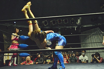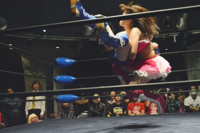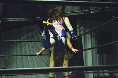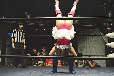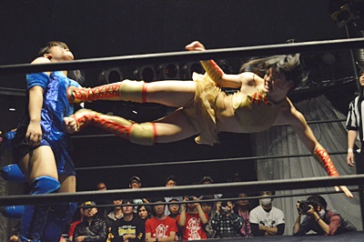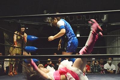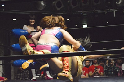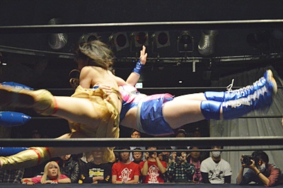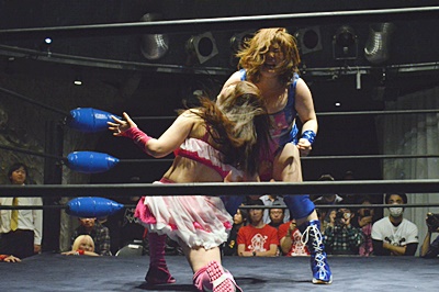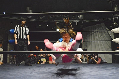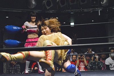 先発はミウラとえーりん。えーりんがドロップキックで先制するがミウラはショルダーブロック(右写真)。