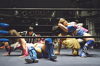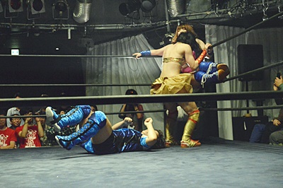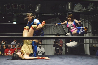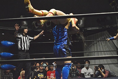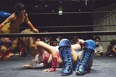ミウラがフルネルソン(左写真)、山下カット。ミウラはのの子にタッチ。