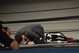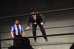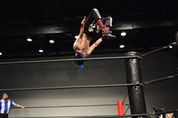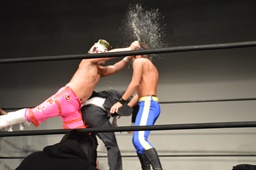 親父ボディスラム、河村リバーススプラッシュ(右写真)、カウント2。