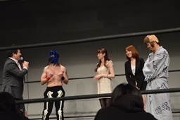 竜に連れられて天海つばさと美波なみ(左写真)がリングに。