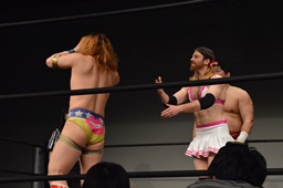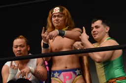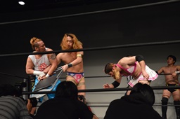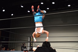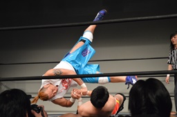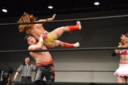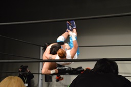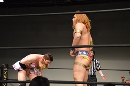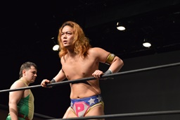 石川コーナーに振って串刺しラリアット、バックドロップ(左写真)、カウント2。ブレーンバスター、FUMA切り返してマルテロにタッチ。