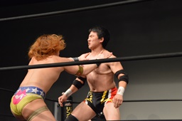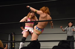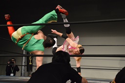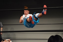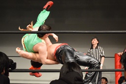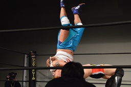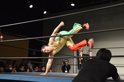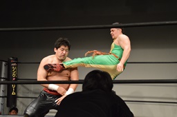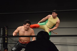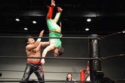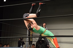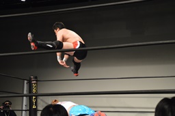 HIROKIボディスラムからライオンサルト(右写真)、カウント2。