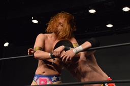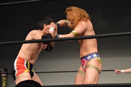 福田ヘッドロックからロープで顔面こすり(右写真)。HIROKIにタッチしようとするがHIROKI拒否、福田はマルテロにタッチ。マルテロパンチ、HIROKIにタッチ。
